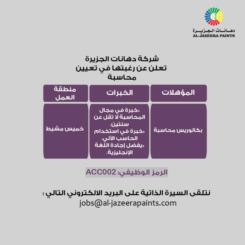 تعلن شركة دهانات الجزيرة عن توفير عدد من الوظائف الهندسية والفنية والإدارية الشاغرة للرجال والنساء، من حمَلة درجة البكالوريوس وشهادة الدبلوم في عدة تخصصات للعمل بفروع الشركة في كل من المدن التالية:-